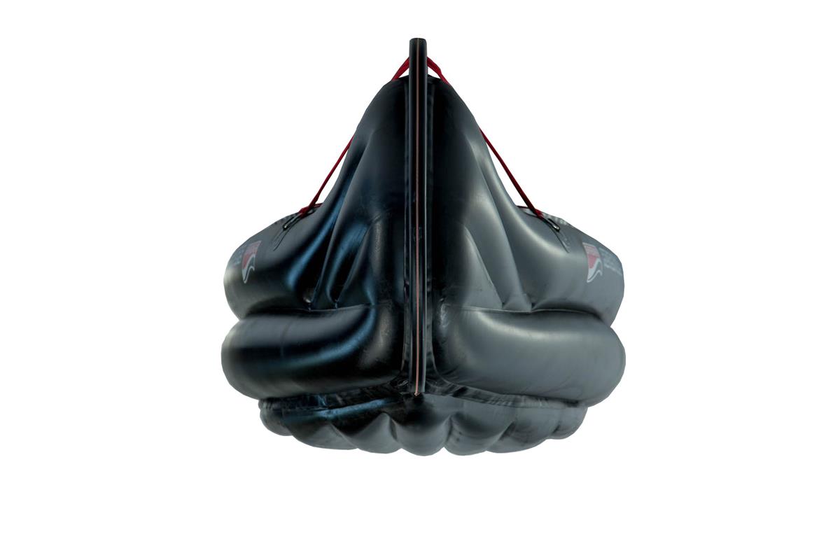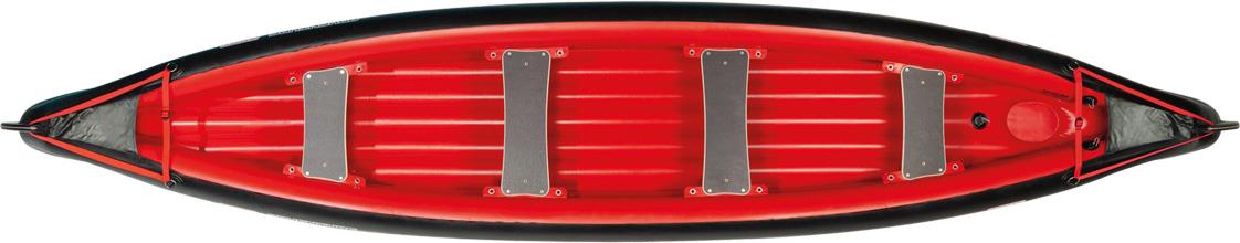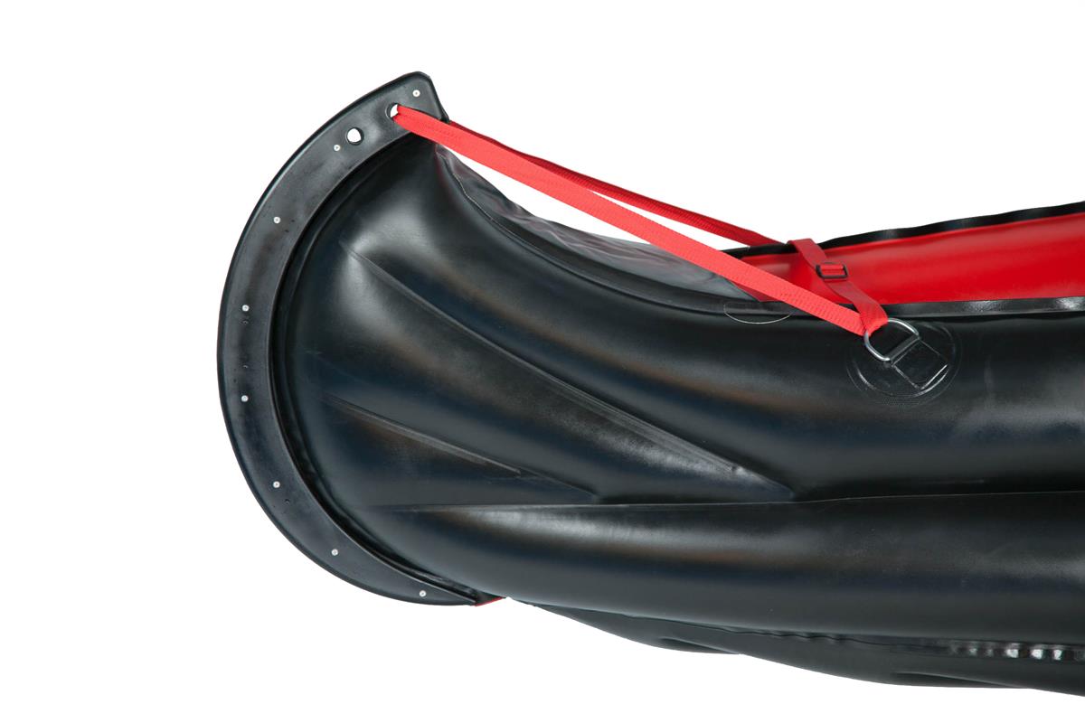 Im großen Gepäcksraum findet auch die umfangreichste ADVENTURE SL Ausrüstung sicher Platz. Für die hermetische Befestigung der Spritzdecke (x) sind an den Seitenwänden Lochleisten aufvulkanisiert. An diesen kann auch zusätzliches Gepäck befestigt werden. Die ideale Farbgebung ist gut durchdacht. Die schwarze Außenhaut (durch hohen Rußanteil besonders zäh und widerstandsfähig) fügt sich unauffällig in die Natur. Die rote Innenhaut kann als Signalfarbe im Notfall lebensrettend sein. Mit 4 Sitzlöchern kann das ADVENTURE SL zu viert gefahren werden.